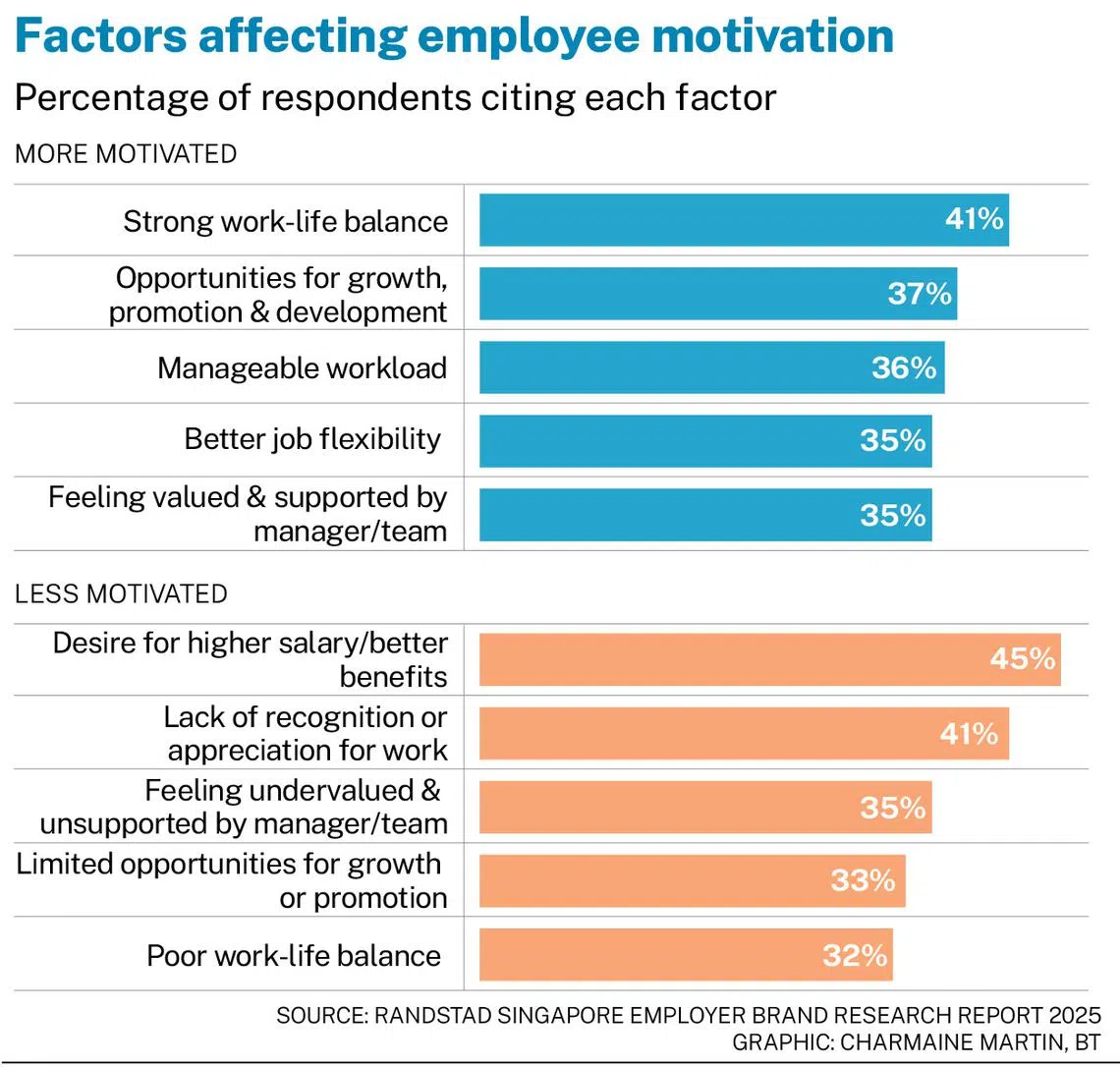 Having a strong work-life balance was also the top reason for respondents to feel motivated and engaged at work, as cited by 41 per cent.